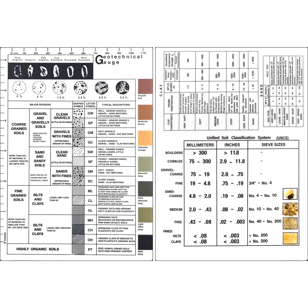 The Geo Guide Card and Geotechnical Gauge provide classification information on a rigid plastic card with a lanyard. It includes soil type samples, classification by type, grain size, and color.